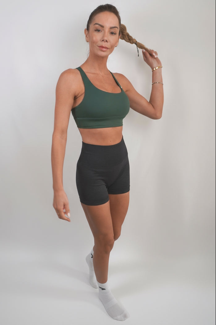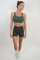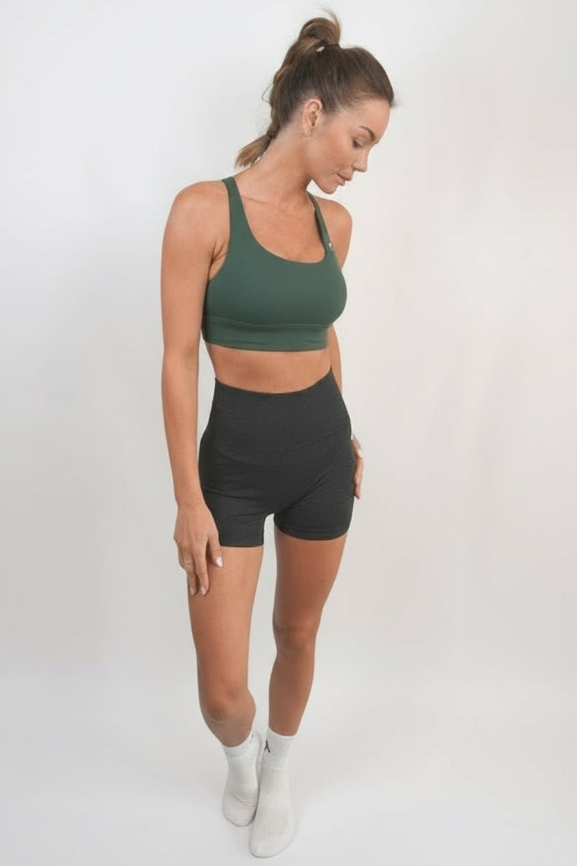High waisted shorts paired with a sleeveless and supportive crop top.